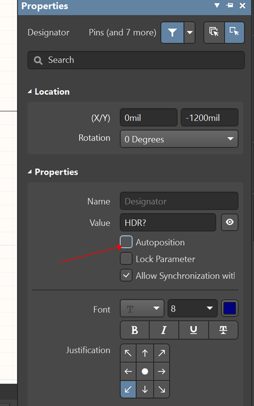 2、調整Designator和Comment的位置,然后分別選中它們,在各自的屬性中把Autoposition的打勾去掉,如果打勾不去掉,雖然在原理圖符號編輯界面更改了Designator和Comment的位置,但是拖放到原理圖后,依然會回到默認位置。