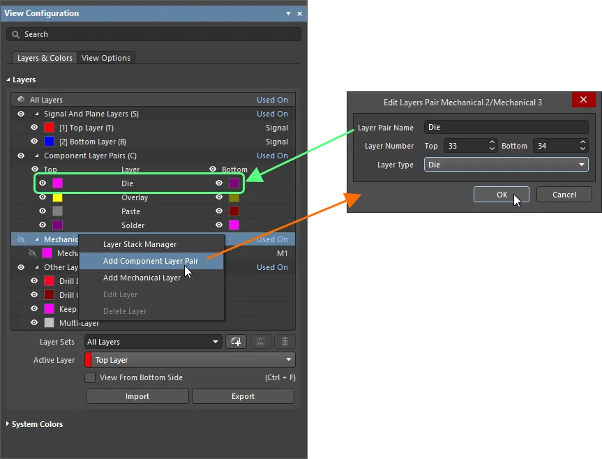 鍵合線放置在專用層上鍵合組件層,可以在View Configuration面板添加: