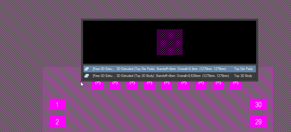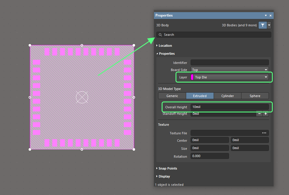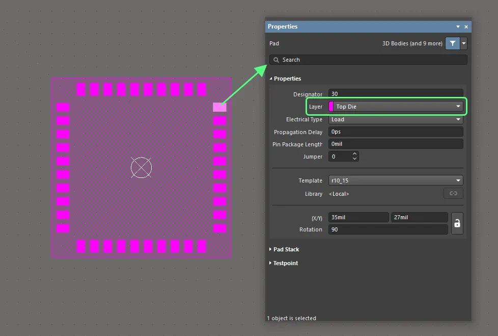 當(dāng)將Die焊盤放置在被擠壓的3D體上(也放置在Die層上)時(shí),它會(huì)自動(dòng)放置在這個(gè)3D主體的總高度上,并且它將被綁定到這個(gè)3D主體的高度。在相同位置存在多個(gè)3D主體時(shí)(例如,當(dāng)PCB被外殼覆蓋時(shí)),焊盤可以保持在正確的3D主體表面上。