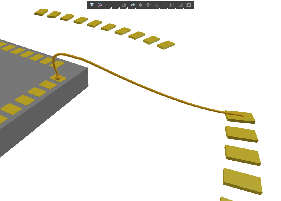 使用Place ? Bond Wire命令或在浮動(dòng)工具欄選擇圖標(biāo)來(lái)放置一條鍵合線。選擇命令后,依次單擊要與鍵合線連接的兩個(gè)點(diǎn)(例如,Die焊盤的中心點(diǎn)和指焊盤的中心)。這一條直線是鍵合線在XY平面的投影,在2D中顯示。在3D中,焊絲根據(jù)其起點(diǎn)和終點(diǎn)的位置和其他屬性進(jìn)行渲染。
