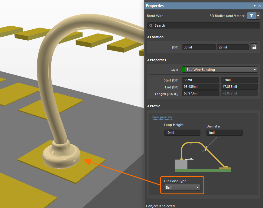 使用屬性面板的“Profile”區(qū)域來(lái)設(shè)置鍵合線的環(huán)高度的值和直徑大小,以及定義鍵合線起點(diǎn)的形狀(球或楔形):