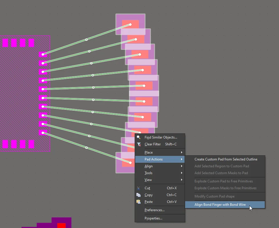 如果鍵合指焊盤的長(zhǎng)邊需要和鍵合線平行,可以選擇鍵合線和連接到它們的鍵合指焊盤,右鍵單擊選擇,然后從右鍵單擊菜單中選擇Pad Actions ? Align Bond Finger with Bond Wire命令。