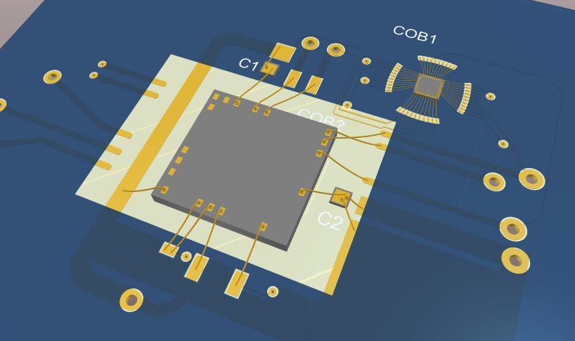 Altium Designer支持使用線鍵合技術(shù)的混合板設(shè)計(jì),特別是芯片直接貼裝在板上(CoB)技術(shù)。這項(xiàng)功能允許設(shè)計(jì)師創(chuàng)建具有定義好的Die Pads的組件,并且一旦放置在原理圖上,通過ECO同步到PCB,就可以使用Bond Wires連接到主板上的常規(guī)焊盤或任何銅區(qū)域。