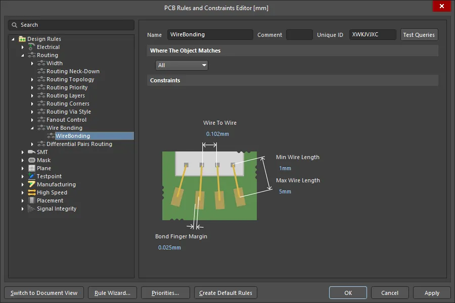 線鍵合設(shè)計(jì)規(guī)則(布線類別)可以在PCB的約束管理器中定義。規(guī)則可以定義相鄰鍵合線之間允許的距離(線到線)、最小鍵合線長(zhǎng)度和最大鍵合線長(zhǎng)度,以及鍵合指焊盤邊緣到與之連接的鍵合線之間的距離/填充(鍵合指焊盤)。線鍵合設(shè)計(jì)規(guī)則由批量DRC支持。