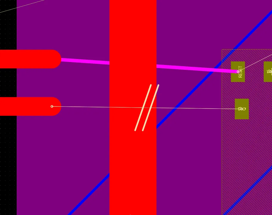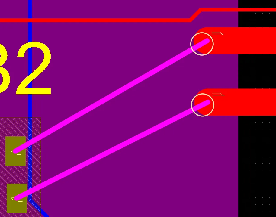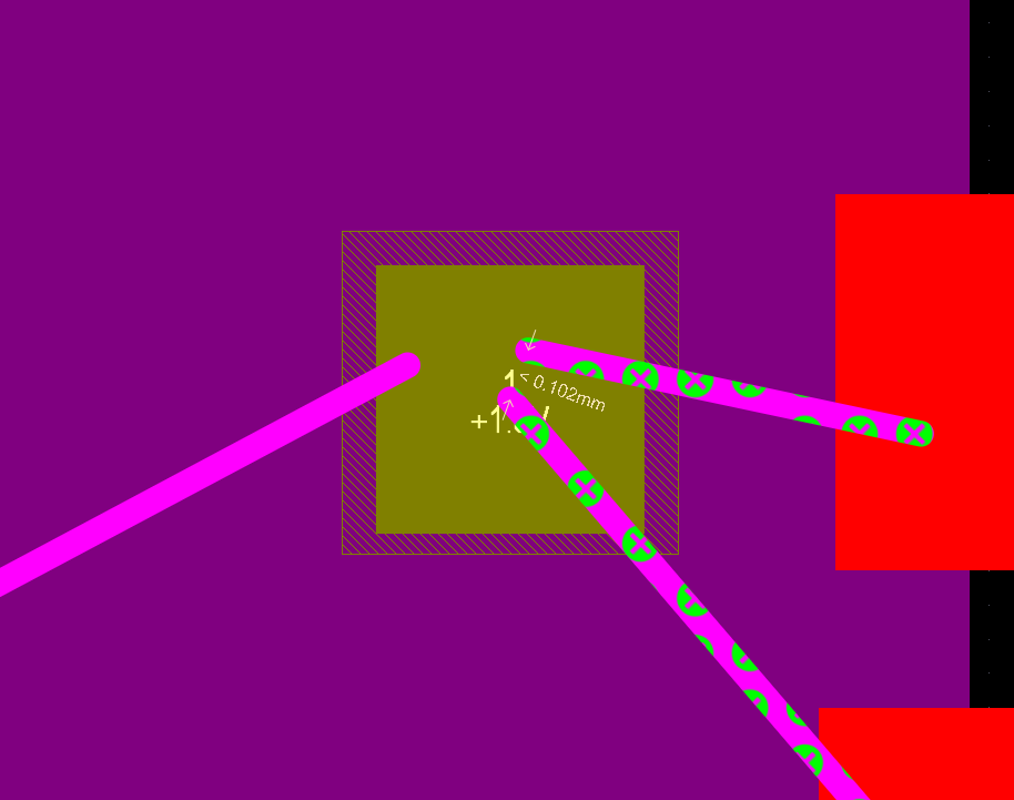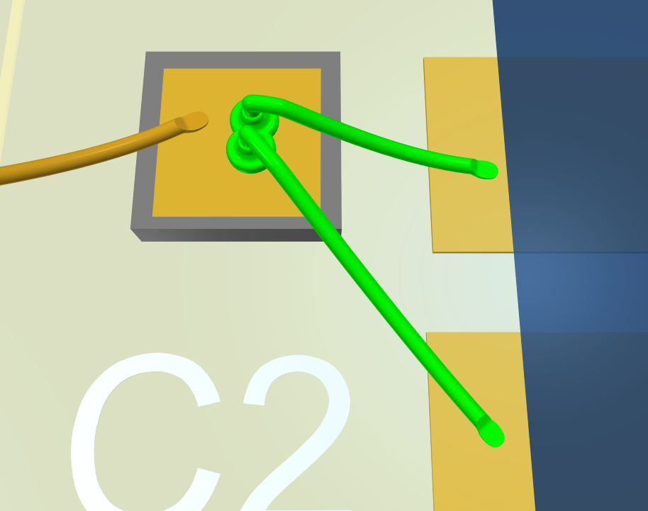 使用 Chip-on-Board 方法時(shí),還可以手動(dòng)放置焊線(與上述相同)以將芯片的管芯焊盤連接到主板上的任何銅上。粘合線將繼承其原Die焊盤的網(wǎng)絡(luò)。多條焊線可以從相同的焊盤發(fā)出,反之,多條焊線可以在主板上的相同銅上完成。下面顯示了具有線鍵合功能的PCB的示例。