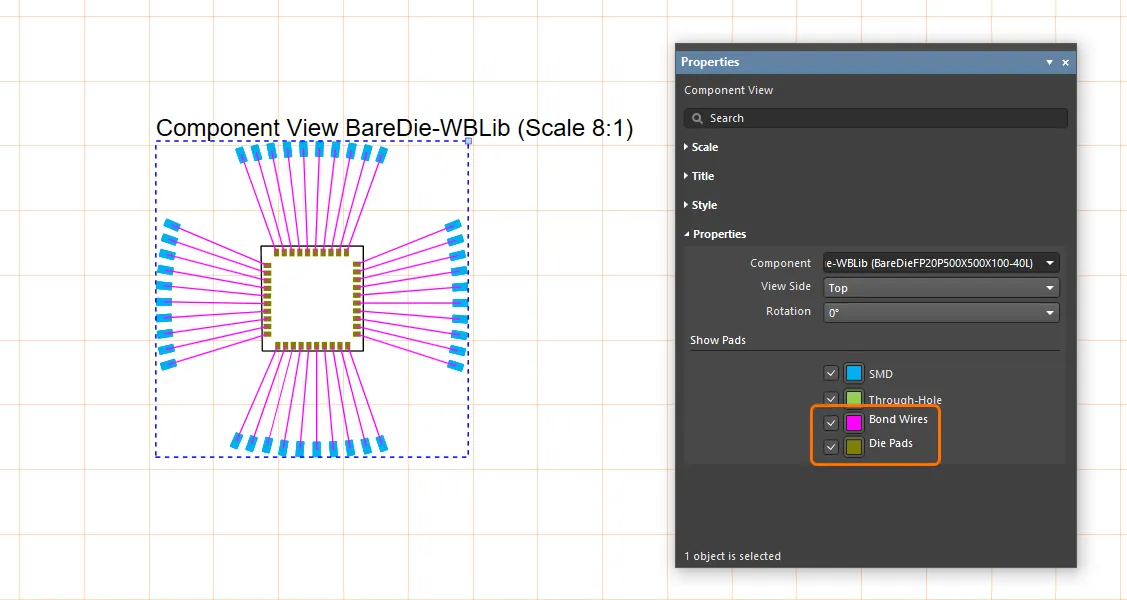 (2)當(dāng)一個(gè)組件具有引線鍵合(即它具有芯片焊盤(s)和連接到它們的鍵合線)時(shí),額外的鍵合線和芯片焊盤選項(xiàng)在屬性中可用 區(qū)域的屬性面板,用于為所選組件視圖放置此組件。使用這些選項(xiàng)分別啟用鍵合線投影和管芯焊盤的圖形。