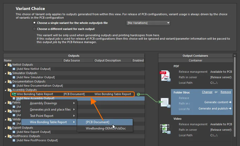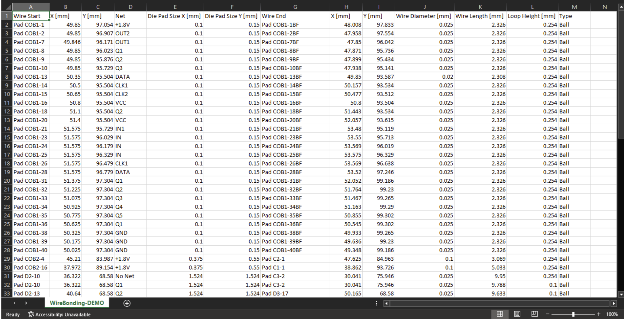 此外,可以生成一個(gè)提供有關(guān)鍵合線連接信息的線鍵合表報(bào)告(CSV格式)。使用輸出作業(yè)文件的裝配輸出區(qū)域中的線鍵合表報(bào)告輸出,來(lái)添加這種類型的新輸出?;蛘?,從PCB編輯器的主菜單中選擇“文件 ? 裝配輸出 ? 線鍵合表報(bào)告”命令,直接從編輯器生成報(bào)告。