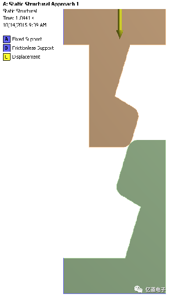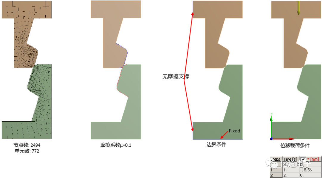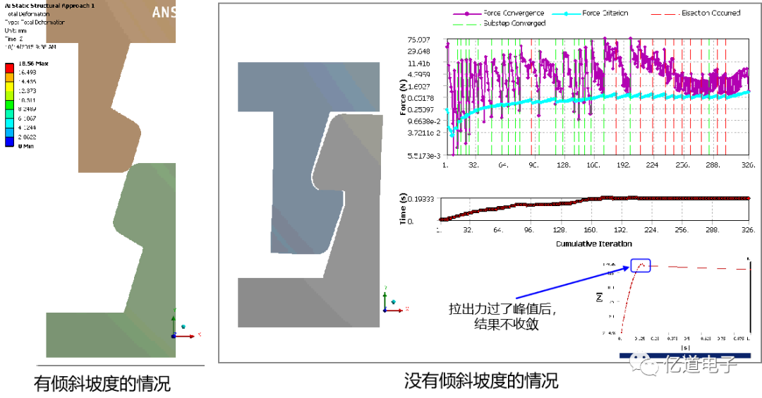 - 傳統的靜力學分析適用于有傾斜坡度卡扣的插拔仿真分析,其模型簡單,求解速度快。