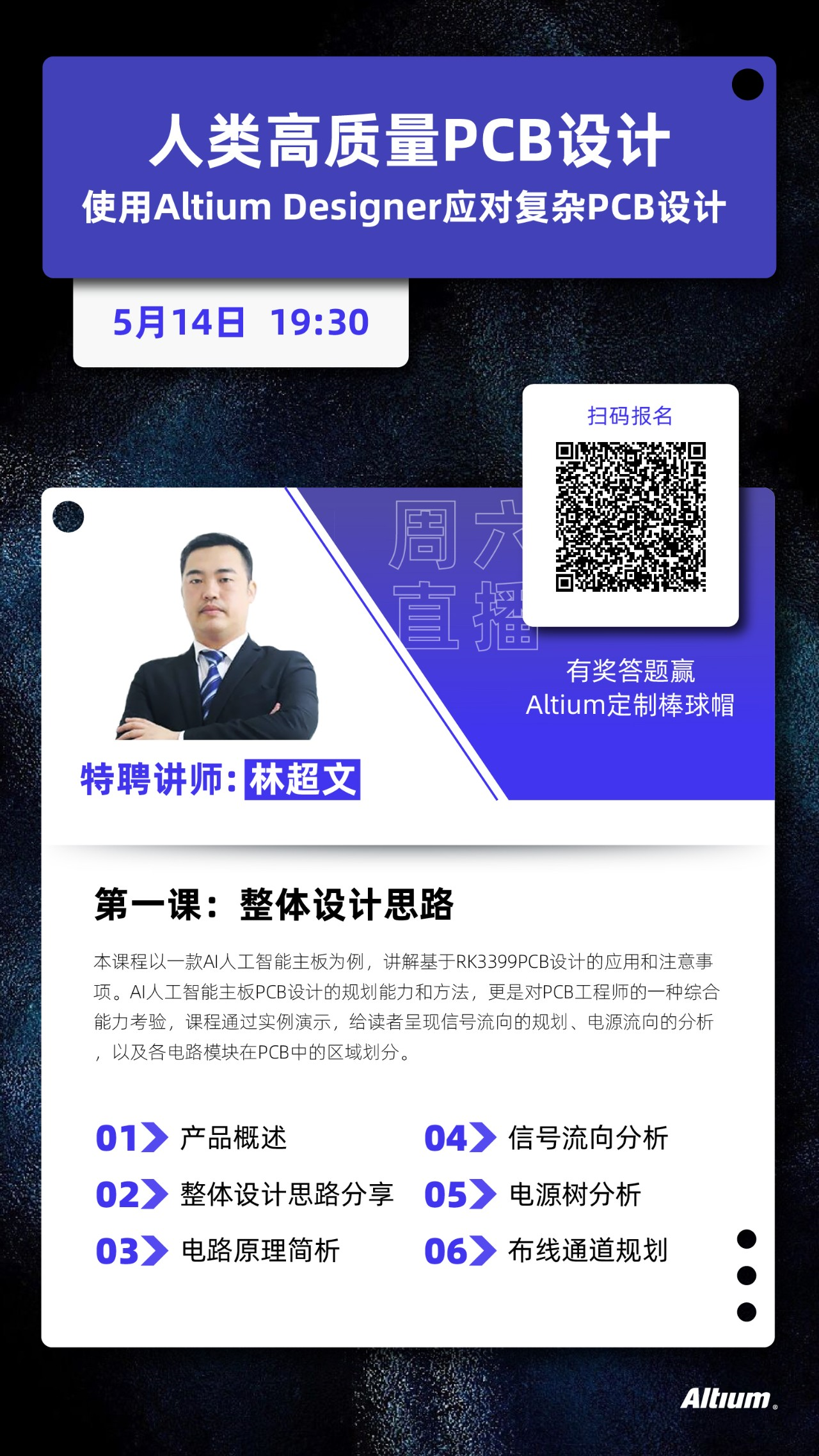 本周六5月14日19:30,林超文老師回歸啦,以一款AI人工智能主板為例為大家帶來全新系列課程——“人類高質量PCB設計”,本周為第一課:“整體設計思路”,同樣設有答題環節,全對即可贏取Altium定制棒球帽~
