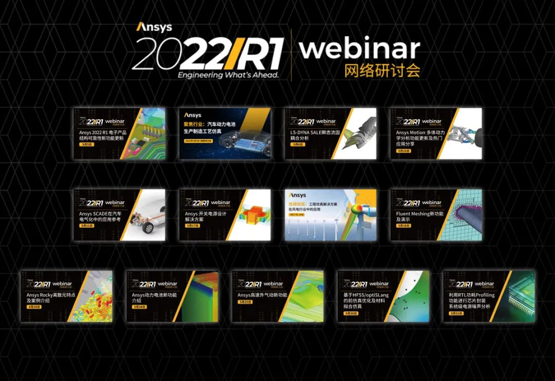 5月,Ansys 2022 R1新品發布系列網絡研討會中推出了:電子可靠性、LS-DYNA SALE、多體動力學、汽車電氣化、開關電源設計、Fluent Meshing、Ansys Rocky、動力電池、高速外氣動、仿真優化、電源噪聲分析等主題內容,以及「汽車動力電池生產制造工藝仿真」和「工程仿真解決方案在風電行業中的應用在線論壇」兩場行業應用線上活動。