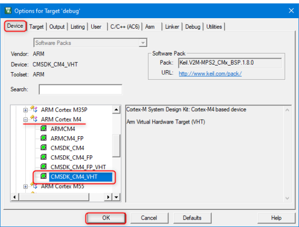 | Cortex-M4,FP | CMSDK_CM4_FP_VHT | Keil.V2M-MPS2_CMx_BSP v1.8.0 | VHT_MPS2_Cortex-M4.exe | 具有 Cortex-M4 內核和浮點單元 (FPU) 支持的 CPU |