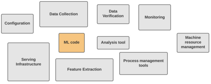 Google 的團隊一直在對構建基于 ML 的系統所帶來的技術挑戰進行大量研究。 一篇關于機器學習系統中隱藏的技術債務的 NeurIPS 論文表明,開發模型只是整個過程的一小部分。 許多其他流程、配置和工具將被集成到系統中。如下圖所示: