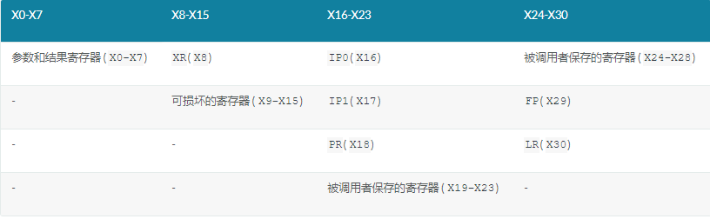函數foo()可以使用的寄存器,且不需要保存的寄存器是X0-X15,但如果foo()要使用X19-X28必須先將其保存到堆棧中,然后在返回之前從堆棧中恢復。