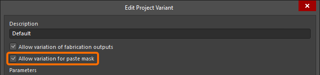 在Edit Project Variant對話框中使用新的Allow variation for paste mask選項,啟用/禁用配置中變量的助焊層輸出。