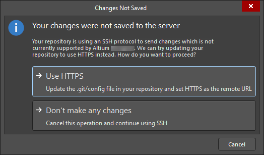 當將更改推送到外部GIT VCS下的項目,或使此類項目在線可用,而其設計所在的中央存儲庫使用SSH協議進行連接(Altium Designer不支持)時,現在您可以選擇嘗試更新中央存儲庫,使用受支持的HTTPS連接協議(前提是中央存儲庫支持該協議)。
