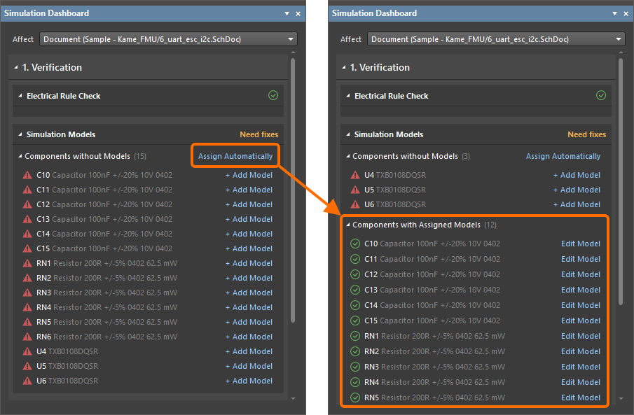 您可以使用該功能自動將仿真模型分配給無模型元件。如需使用此功能,請在仿真控制面板Verification階段下的Components without Models區域中單擊Assign Automatically。搜索將在以下來源依次執行: