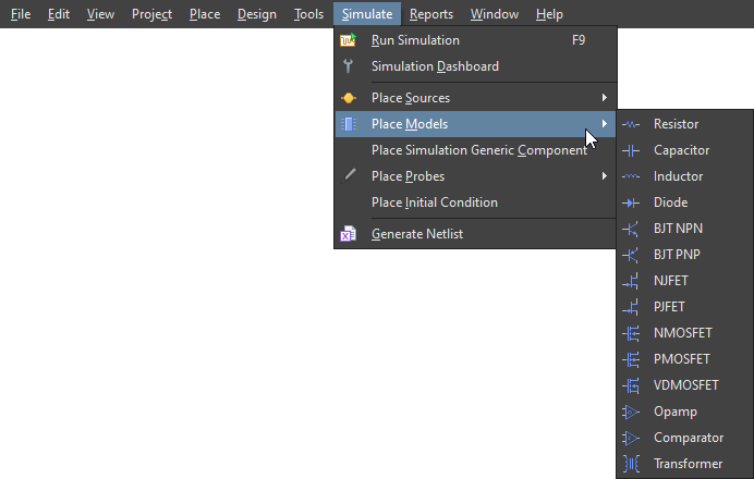 在此版本中,您現在可以從Simulate主菜單快速訪問最常用的仿真通用元件(電阻、電容器、晶體管等)。
