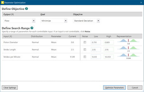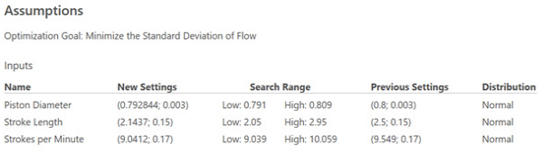 基于以上結(jié)果,如果要減小標(biāo)準(zhǔn)差,則應(yīng)當(dāng)減小沖程長(zhǎng)度和每分鐘沖程數(shù)。活塞直徑可以保持類似大小。請(qǐng)記住,Monte Carlo 模擬的關(guān)鍵之處在于,能夠在不構(gòu)建單個(gè)新原型或進(jìn)行新試驗(yàn)的情況下找出所有這些結(jié)果。