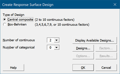 要在 Minitab 中創(chuàng)建響應(yīng)曲面試驗(yàn),請(qǐng)選擇統(tǒng)計(jì) > DOE > 響應(yīng)曲面 > 創(chuàng)建響應(yīng)曲面設(shè)計(jì)。由于我們有兩個(gè)因子(電壓 (Vdc) 和電流密度 (ASF)),因此我們將選擇試驗(yàn)次數(shù)為 13 的雙因子中心復(fù)合設(shè)計(jì)。