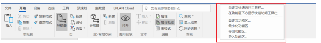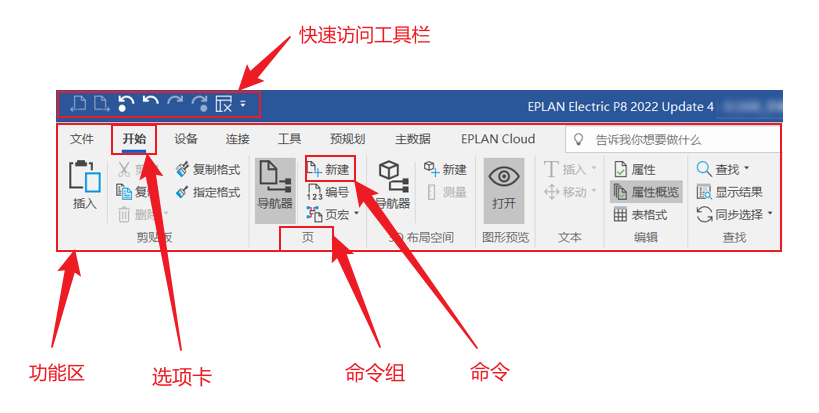 EPLAN Electric P8 2022(下面簡稱P8 2022)現在不再通過菜單和工具欄,而是借助功能區為導航器和圖形編輯器選擇命令。該功能區與熟知的 Microsoft Office 產品功能區具有相同的功能和結構。功能區的界面結構和名稱對應關系如下圖: