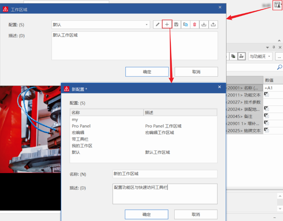 在自定義功能區之前,建議先新建一個新的工作區域,以此保存適合個人喜好或工作任務的界面配置。也可以將已配置完成的工作區域進行導入導出,方便配置的轉移和保存。