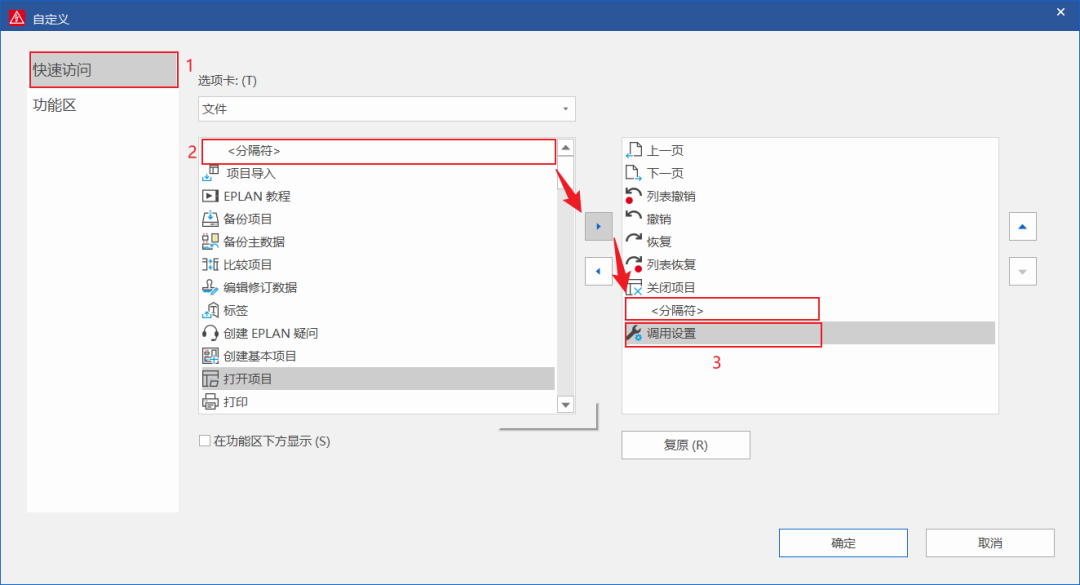 ??選擇【快速訪問】,選中右側窗口的【關閉項目】命令,將左側的【<分隔符>】按箭頭指示添加到【關閉項目】命令下方。