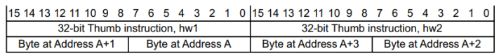 Thumb指令要求強(qiáng)制16位對(duì)齊,那么32位指令就會(huì)分成兩個(gè)半字hw1,hw2。其中hw1位于較低地址。在下圖所示中hw1位于hw2的左側(cè)。