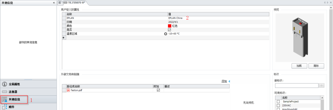 更新完成后,任意一個【TE.735075-0】的屬性中可以看到新增的用戶自定義屬性,保存工作區,注意,不保存工作區,無法將新增的用戶自定義的屬性同步到釘板圖或報表中。