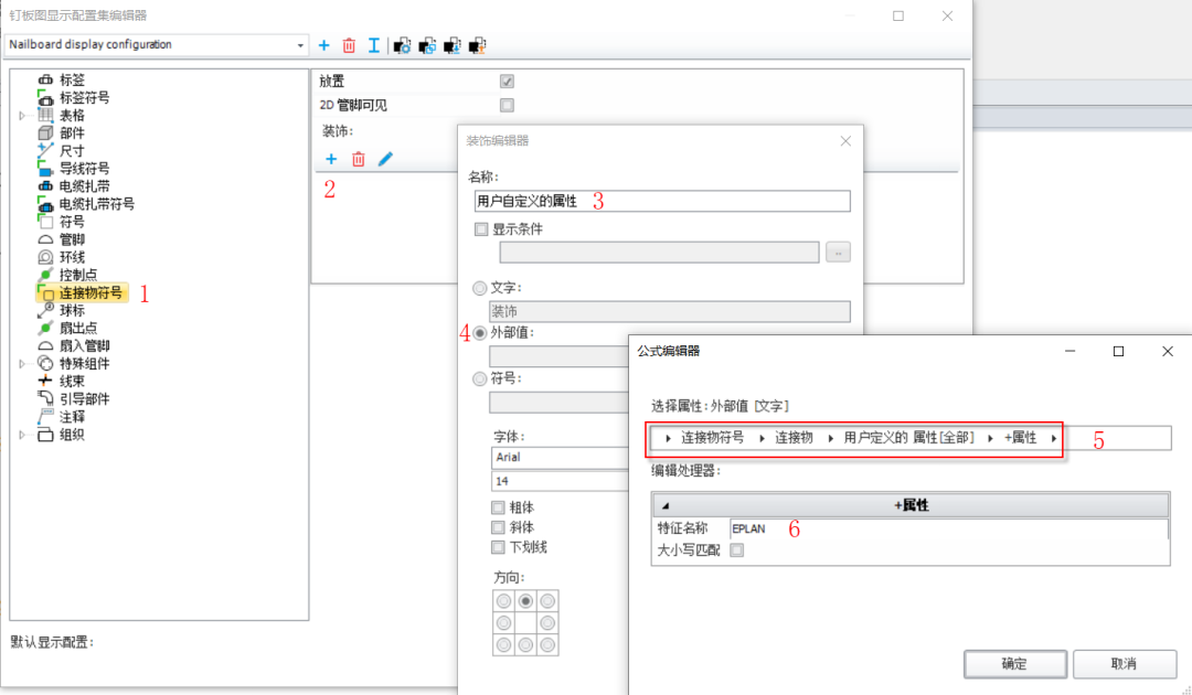 接下來配置連接物符號顯示【用戶自定義的屬性】,在【釘板圖顯示配置編輯器】-【連接物符號】-【添加裝飾】,在【裝飾編輯器】的名稱輸入【用戶自定義的屬性】,勾選外部值,在彈出的【公式編輯器】中如下圖屬性配置,依次添加屬性,最后在【特征名稱】中輸入用戶自定義的屬性名稱【EPLAN】,然后保存確定。
