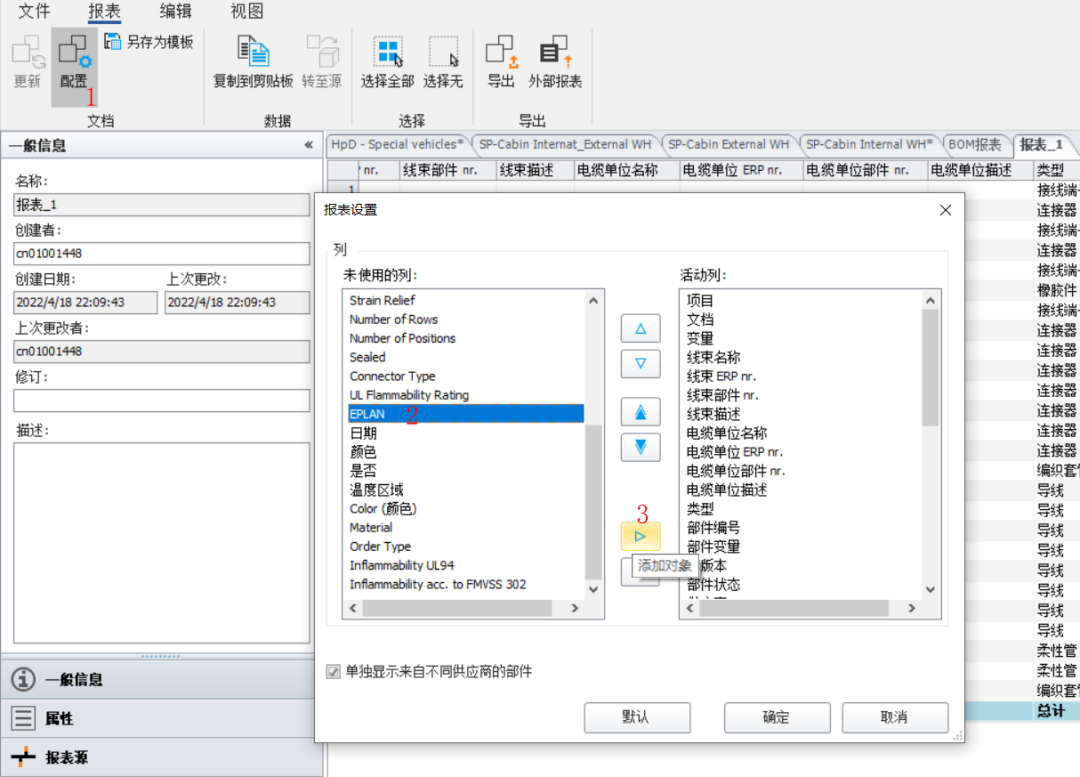 在報表中,打開【配置】,在【報表設置】對話框中,在左側的列找到用戶自定義的屬性【EPLAN】,然后點擊向右的箭頭,移動到右邊的【活動列】,確定,如下圖。