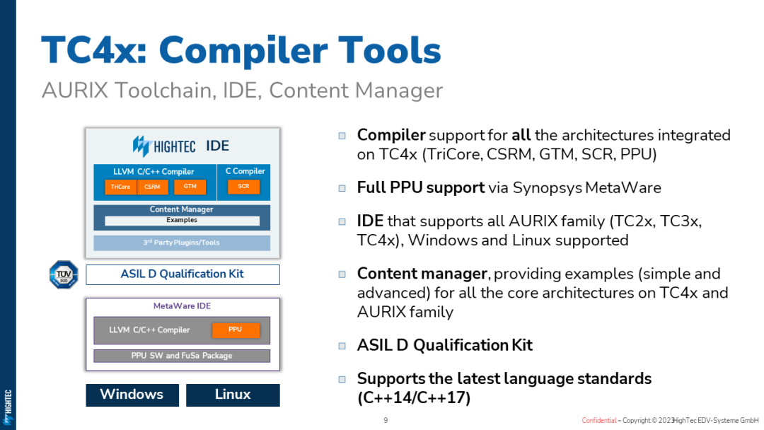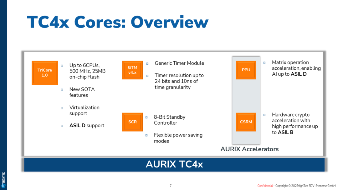 >?對于TC4x的主核TriCore TC1.8核,目前最新版本是7.0.0版本,兼容TC3x、TC2x芯片的編譯,支持MCAL和illd以及主流的AUTOSAR供應(yīng)商,支持虛擬化,支持雙精度浮點運算。