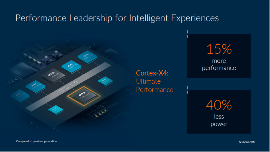 作為第四代 Cortex-X 內核,新的 Arm Cortex-X4是該高性能集群的關鍵組成部分,可突破旗艦智能手機的性能極限。Cortex-X4 是 Arm迄今為止打造的最快速的 CPU,與 Cortex-X3 相比,其性能提高 15%。與此同時,基于相同工藝的全新高能效微架構可降低功耗達 40%。這一性能和效率的提升可以將設備使用體驗(如 UI 響應能力和應用程序啟動時間)提升到一個新的水平,并讓實現面向下一代人工智能和機器學習的應用成為可能。