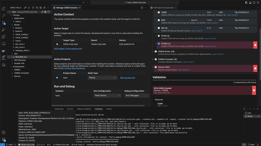 CMSIS-Toolbox實現了基于CMSIS-Pack的開發(fā)流程,是Keil MDK Version 6的關鍵組成部分。它在Keil Studio中可用,但也在μVision IDE中可用,后者已經是嵌入式開發(fā)的事實標準多年了。CMSIS-Pack框架支持可以使用多個工具鏈(例如Arm Compiler 6、GCC和LLVM)的項目。包系統(tǒng)提供了來自許多供應商的可重用軟件組件,包括各種RTOS內核、設備驅動程序和中間件。