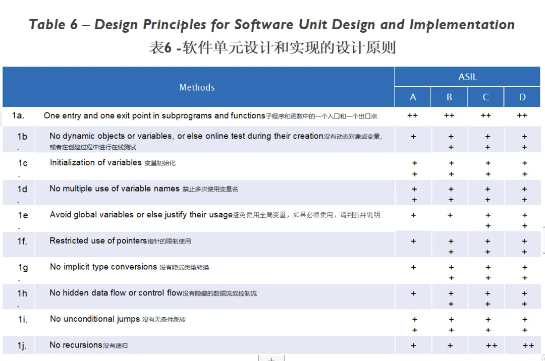 例如,在下面的表6中(第7頁),子程序和函數中的一個入口點和一個出口點被強烈推薦給所有的ASIL等級,而沒有遞歸只被推薦給較低的級別。