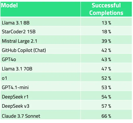 Claude 3.7 Sonnet以66%的成功率穩(wěn)居提示式代碼補(bǔ)全榜首。
