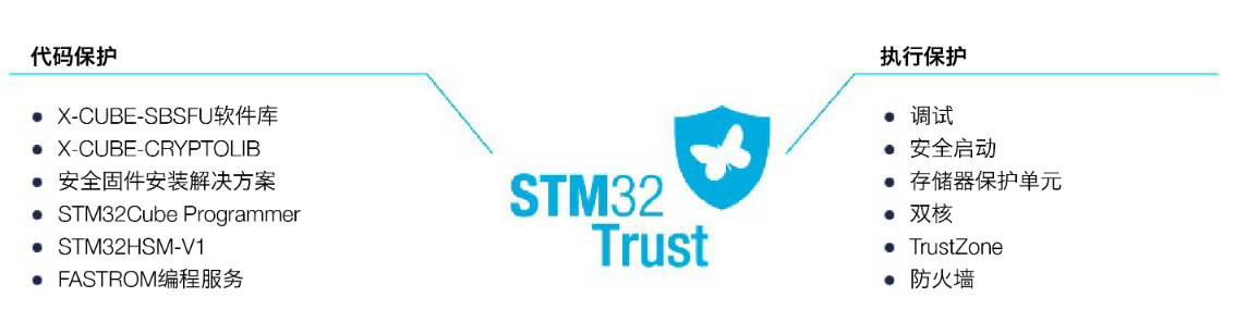 提到安全,就不得不提到STM32Trust,STM32Trust的生態系統集成了所有可用資源,包括stm32系列信息安全相關的芯片技術、免費參考估計,免費工具和服務等,并通過強大的多級策略來增強安全性。