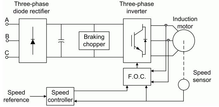 此環節可以對獲得的DC電壓進行變換,通過斬波調制的方式得到可調的直流電壓,是一個DC-DC的轉換環節。此外因為前路的AC-DC環節是使用的不控整流,為了解決可能會有的泵升效應,此環節帶有制動功能,將電機的饋入能量通過制動電阻進行消耗。