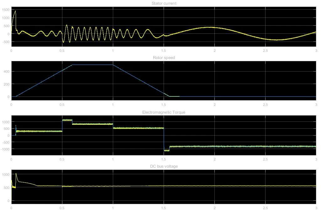 (6)、?1.5-1.55s:此時負載轉矩變為負值,電機變為發電機運行,此時轉速不為零,為了跟隨給定轉速,電磁轉矩要比負載轉矩要小,這樣才能繼續實現減速,從而跟隨給定,至1.55s時轉速變為零。