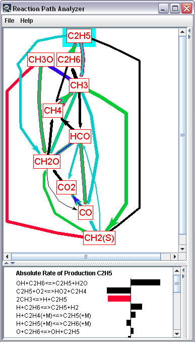 為了幫助您獲得關(guān)鍵動力學(xué)的關(guān)聯(lián)關(guān)系,CHEMKIN-PRO提供了反應(yīng)路徑分析。反應(yīng)途徑分析工具采用交互式、可視化的顯示界面,清晰顯示主導(dǎo)反應(yīng)的路徑,從而為機(jī)理的開發(fā)和機(jī)理簡化提供了手段。