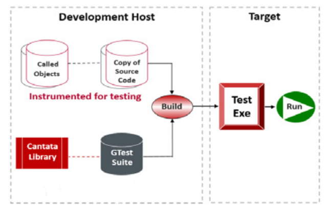 針對(duì)目標(biāo)環(huán)境的CANTATA庫(kù)的部署與源代碼和GooqleTest套件相鏈接。當(dāng)這個(gè)混合測(cè)試exe運(yùn)行時(shí),它執(zhí)行GooqleTest套件中的所有GooqleTest和gooqlemock宏,并與它們等效的Cantata測(cè)試框架指令并行,收集每個(gè)測(cè)試實(shí)現(xiàn)的CANTATA代碼覆蓋率。