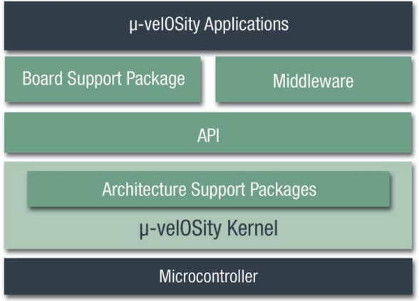 μ-velOSity RTOS具有獨(dú)特的體系結(jié)構(gòu),其中應(yīng)用程序、中間件和驅(qū)動(dòng)程序都運(yùn)行在內(nèi)核之外
