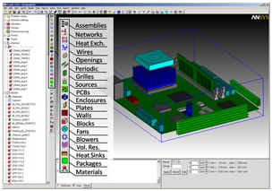 ANSYS Icepak軟件包含許多快速的功能,能夠快速創建和模擬集成電(IC)封裝、印刷電路板和完整電子系統的電子元件散熱模型。只需拖拽預定義的模型對象(包括機柜、風扇、包裝、電路板、通風孔和散熱器)的圖標,即可創建模型,從而創建完整電子系統的模型。