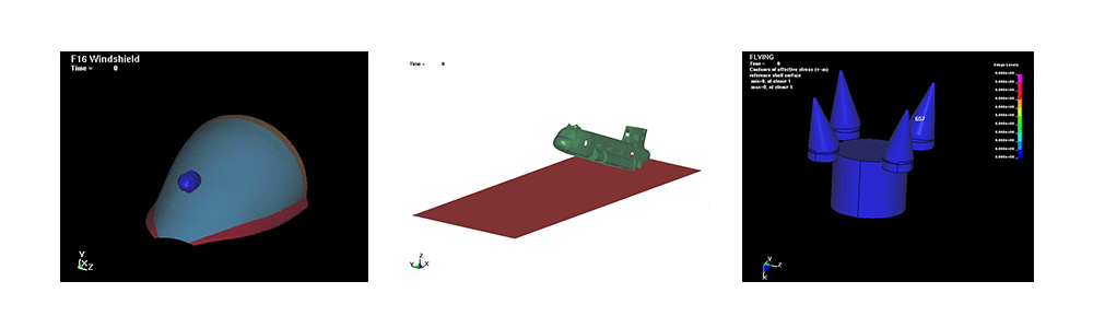 LS-DYNA在模擬高速沖擊、射流和爆炸等問題方面提供了高效、精確的解決方案。通常,飛機機身有大量的連接,如鉚接、焊接、粘結等結構,這些結構的處理是總體分析中極為重要但又難以處理的問題,LS-DYNA為機身在振動、沖擊等作用下的動力分析提供了有效的手段。一方面,軟件本身提供了鉚接、焊接(焊縫、點焊)、粘結等各種功能;另一方面顯式求解方法在振動等瞬態分析中容易處理連接、接觸等因素。LS-DYNA提供的ALE和SPH算法非常適合進行高速沖擊的研究。大型的本構方程庫、相關的非線性材料、復合材料以及相應的失效模式等多個選項構成了許多航空航天領域有限元模擬必需的元素。這些特性可以用于飛機事故模擬、優化飛機和渦輪葉片的設計、鳥撞分析、火箭分離過程模擬等。