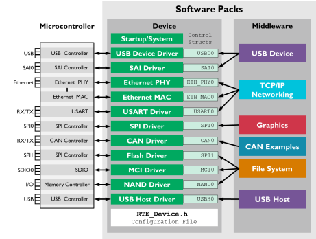 現在的微控制器提供了大量的通信接口來滿足嵌入式設計的需求。然而,開發實現這些接口是很大的挑戰。中間件組件對于開發者高效使用器件的功能就顯得很必要。中間件組件包括: