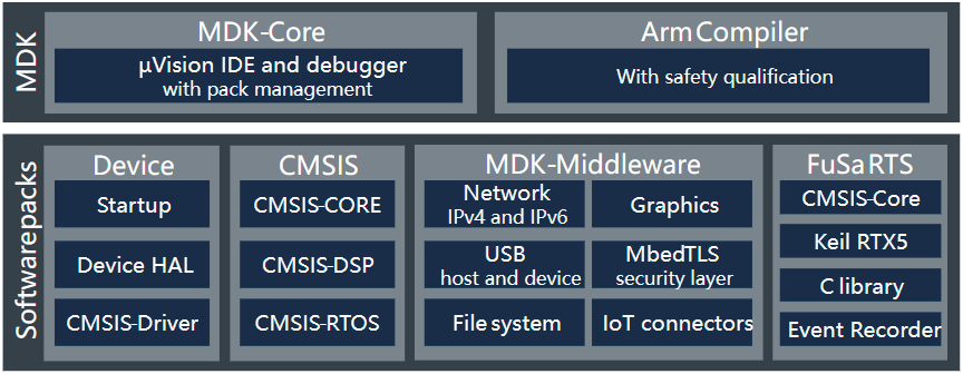 軟件包括IDE,C / C ++編譯器,調試器,軟件包管理和CMSIS。MDK5版軟件包添加新的運行時環境(RTE)來管理設備的支持和軟件組件。