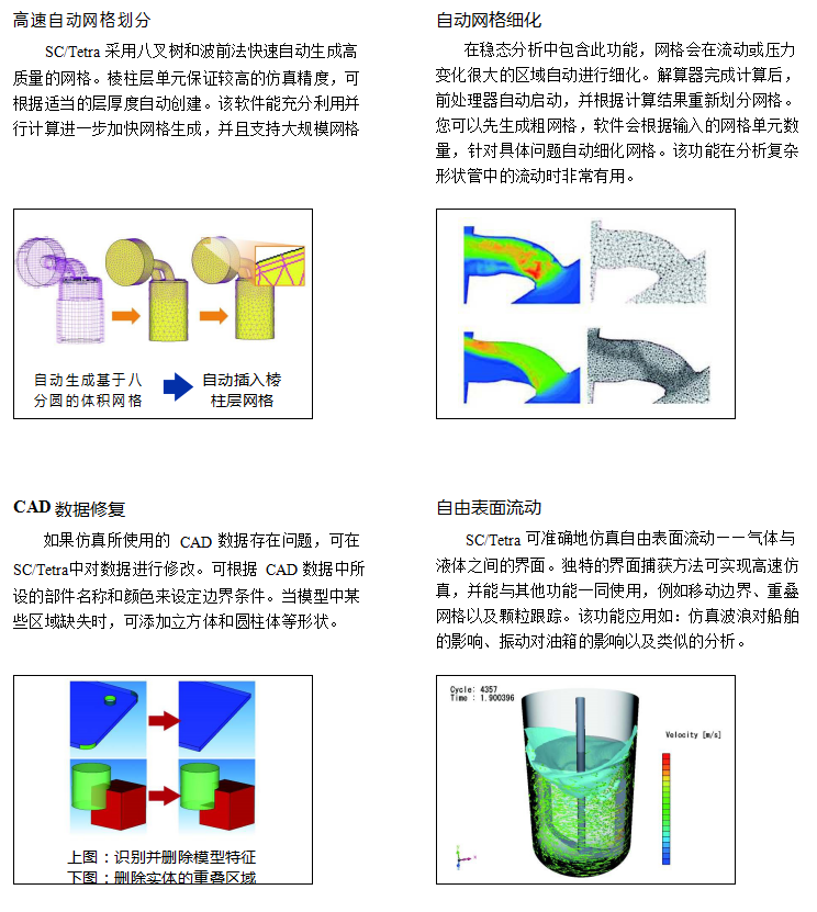 SC/Tetra 是通用熱流仿真軟件,它采用混合網格,能準確地表征表面形狀。它具有以下特點:復雜的網格生成系統、計算時間短、內存消耗低、便于用戶操作。您可以更快速地獲得高精度的計算流體力學結果。