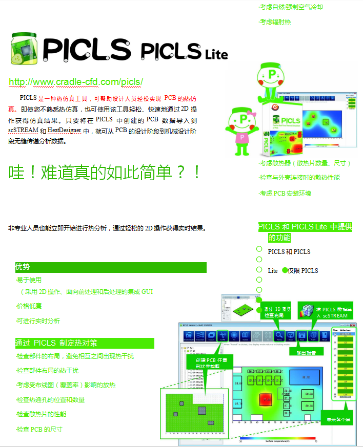 ScSTREAM 熱流體軟件已經為電子和建筑行業服務了三十多年。該軟件不斷推陳出新,無以倫比的友好界面和快速的求解能力是該軟件的兩大特色。HeatDesigner 是以 scSTREAM 為基礎、專門為電子產品的熱設計而開發的。HeatDesigner 提供了熱設計所需的物理模型及功能,界面操作簡單、計算性能強大。