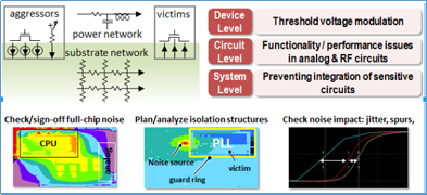 電路中常見的是來自于高速數(shù)字電路的噪聲到敏感的模擬及RF塊的噪聲耦合。這需要展開真正的模數(shù)混合電源噪聲及可靠性分析。
