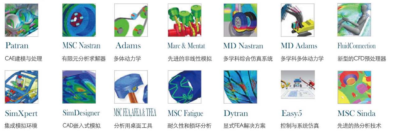 在公司悠久的歷史中,MSC已經開發或收購了其他很多知名的計算機輔助工程(CAE)技術應用,包括Patran,Adams,Marc,Dytran ,SimDesigner, SimManager,資訊工程,EASY5,Sinda和Fluid Connection等。我們正致力于新計算機輔助工程(CAE)工具以及這些新產品所包含的技術的不斷發展,技術主要包括MD Nastran,MD Adams SimXpert,能夠集成獨立計算機 輔助工程(CAE)工具的技術到統一的多學科的求解器和用戶環境中。這些"下一代"產品,因為包含多物理場和多學科互動,使工程師能夠改善他們的虛擬原型的準確性和可靠性。