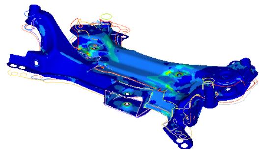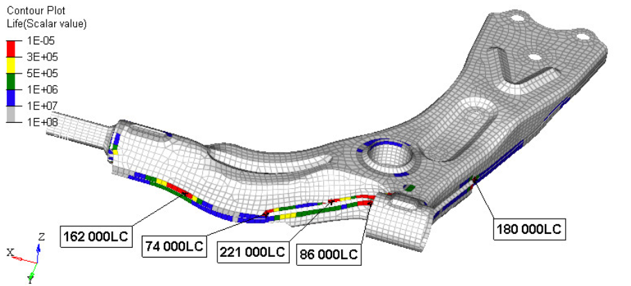 · 縫焊疲勞耐久分析 以轎車下控制臂為研究對象,通過使用軟件Ansys nCode designlife的焊縫疲勞分析功能,基于焊縫熱影響區域(HAZ)的焊趾和焊根單元應力值用于疲勞壽命評估。